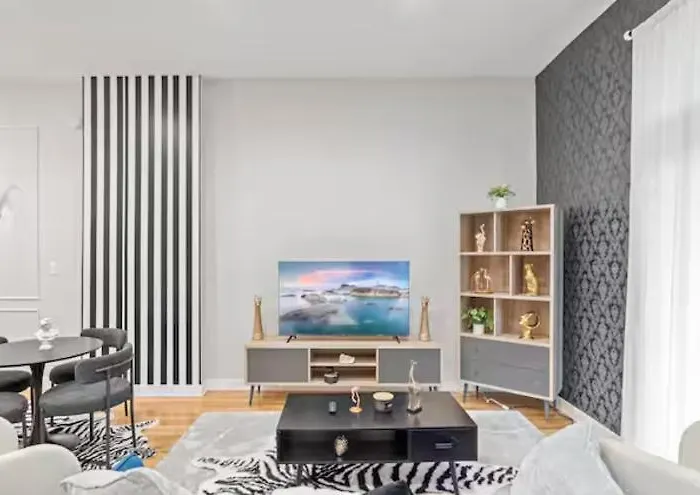 2 Bd 2 Ba Bucktown Safari Flat Appartement van 93 m^2 biedt gemakkelijke toegang tot verschillende stadsattracties, zoals Fresh Market Place, gelegen op maar 5 rijminuten verderop. Gelegen op 15 minuten rijden vanaf Magnificent Mile, biedt het appartement de gasten schoonmaakfaciliteiten, zoals een wasmachine.